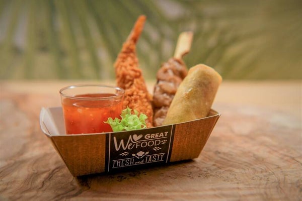 Een trio van warme hapje; een gemarineerd kippenbrochette, mini loempia en scampi dit met een sausje.