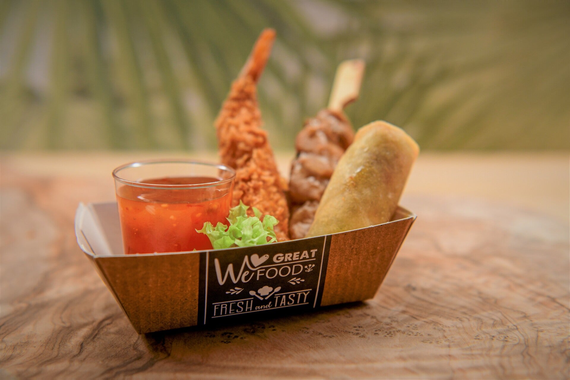 Warm apero hapje: Scampi, mini loempia en sate van kip of
