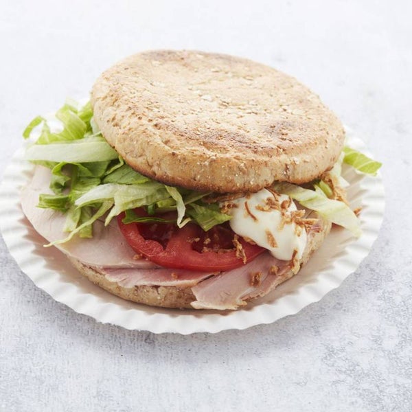 Spitburger met Breydelham, Tartaarsaus, Pain Bagnat, ijsbergsla, Tomaat, en crispy ajuin.